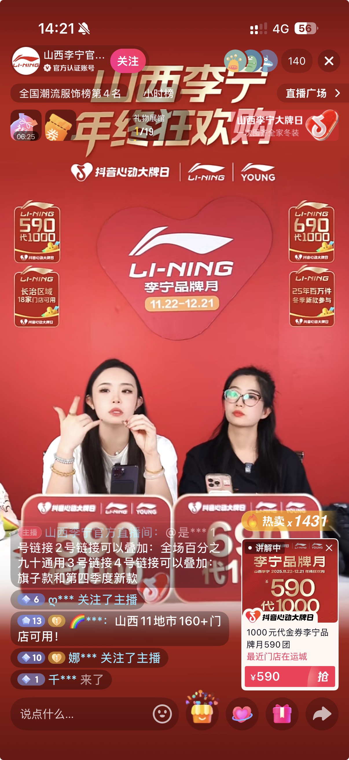 系列好品,诚意拉满:一场引燃年末消费的直播盛宴 本次李宁与抖音心动大牌日的合作,以一场诚意十足的线上直播盛宴为核心引爆点,精准触达运动消费群体。活动期内,品牌不仅首发了备受瞩目的2025年运动生活系列新品,更推出了极具吸引力的“590元抵1000元”、“690元抵1000元”平台专属代金券,将“全年仅此一次”的促销力度落到实处,激发了用户的囤货热情。通过集中释放重磅优惠,品牌打造了一个兼具产品力与价格吸引力的强大“心动货盘”。